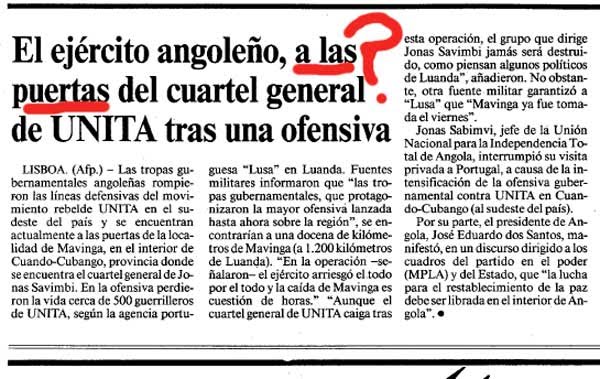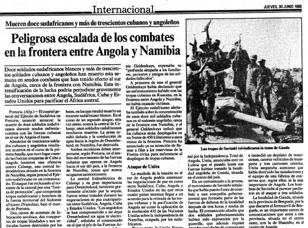 30 de junho de 1988: O jornal "La Vanguardia " de Espanha, informou a escalada dos combates perto da fronteira entre Angola e Namíbia, com a morte de doze soldados e mais de três centenas de soldados Africanos de Cuba e Angola. Como mostrado no texto, o avanço das tropas cubanas à fronteira com a Namíbia e o bombardeamento de alvos civis em Ruacana e Caluemque quando ocorriam negociações de paz entre Angola, Cuba e África do Sul, que não ajudou, e comprometeu o resultado final.