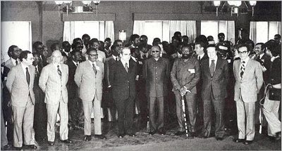 Da esquerda para a direita: Melo Antunes, Rosa Coutinho, Agostinho Neto, Costa Gomes, Holden Roberto, Jonas Malheiro Savimbi, Mário Soares, Almeida Santos. Este grupelho tratava em traição o chamado acordo de Alvor com duas versões: