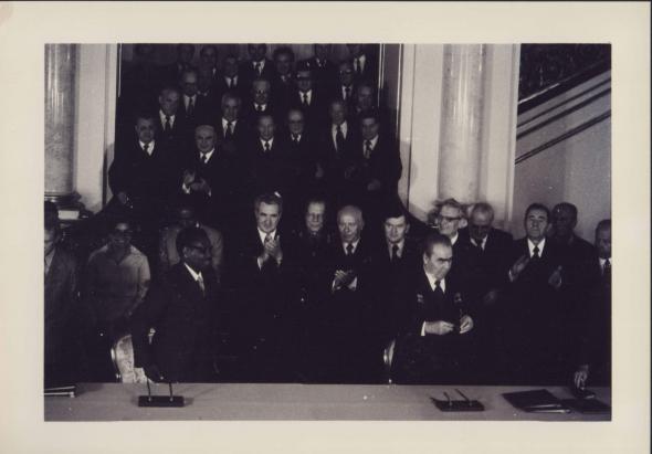 Agostinho Neto (lado esquerdo) e Leonid Brezhnev na assinatura dos acordos com a União Soviética.