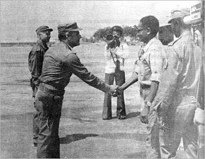 Agostinho Neto recebe Rafael de Pino há sua chegada ao aeroporto militar português em Belas, Luanda. Em Maio de 1986 o General Rafael de Pino "herói" da República de Cuba desertou de Angola numa avioneta junto ao seu filho Ramsés que se encontrava também em Angola e,